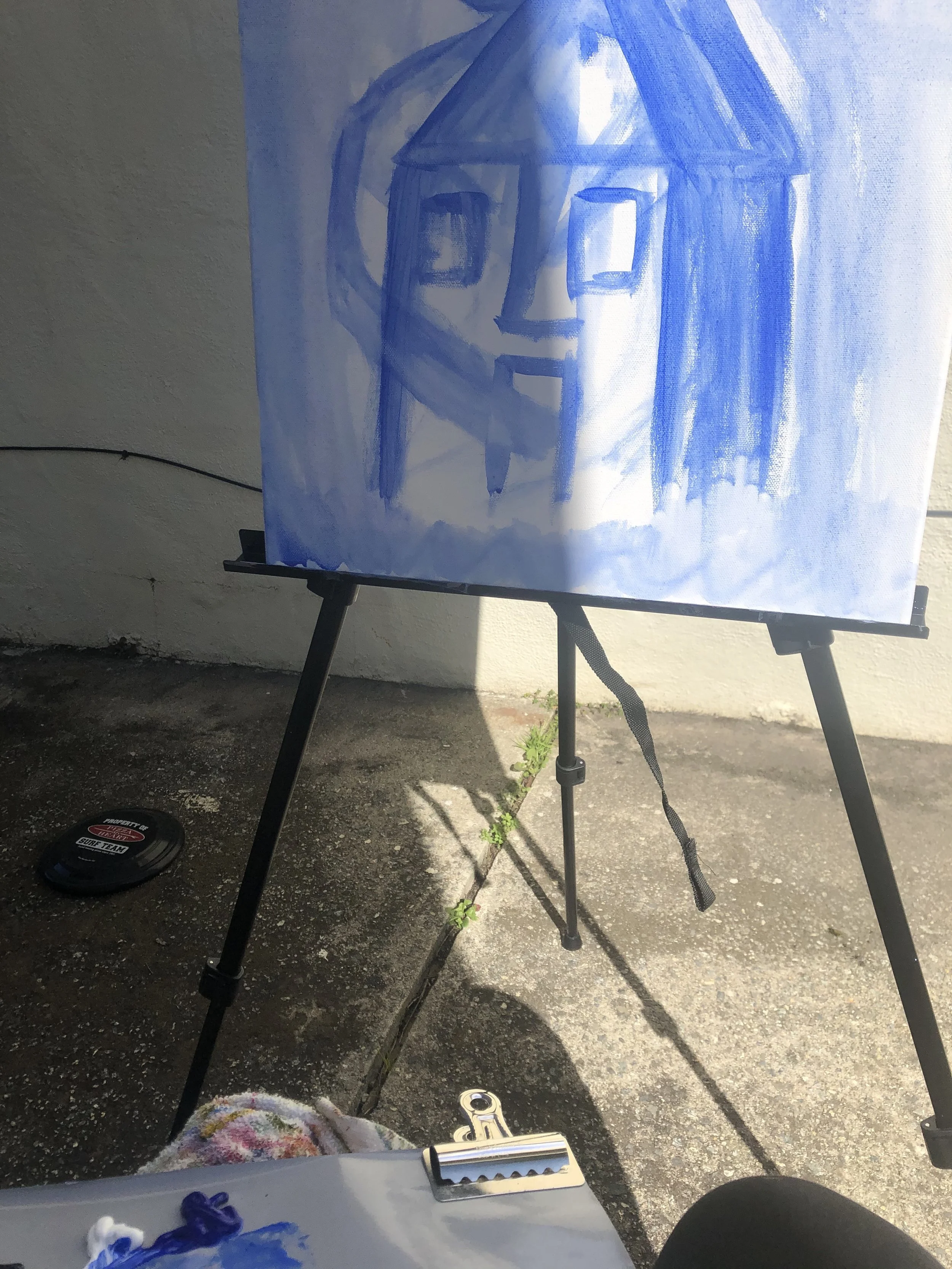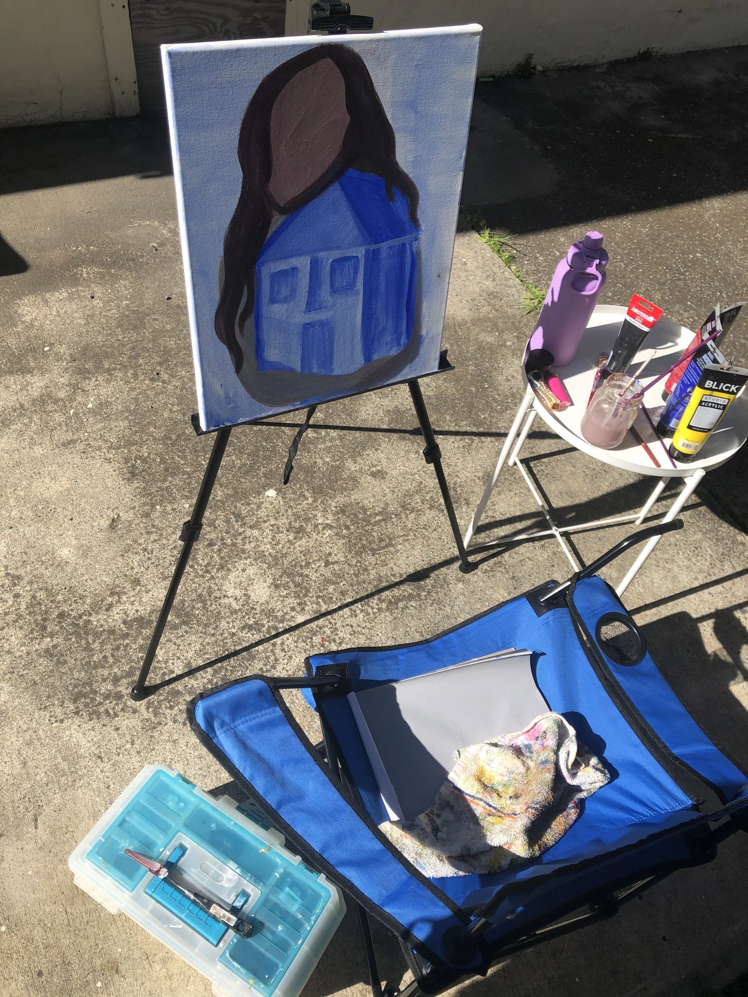 The first iteration of the painting was inspired by the concept of home. With the COVID-19 pandemic, I, as well as many people in the US, were encouraged to stay at home. At the time I lived with 4 of my closest friends in Santa Cruz in a 3 bedroom house. I had lost access to the studio and began to build my own in our garage- this studio became my safe heaven.