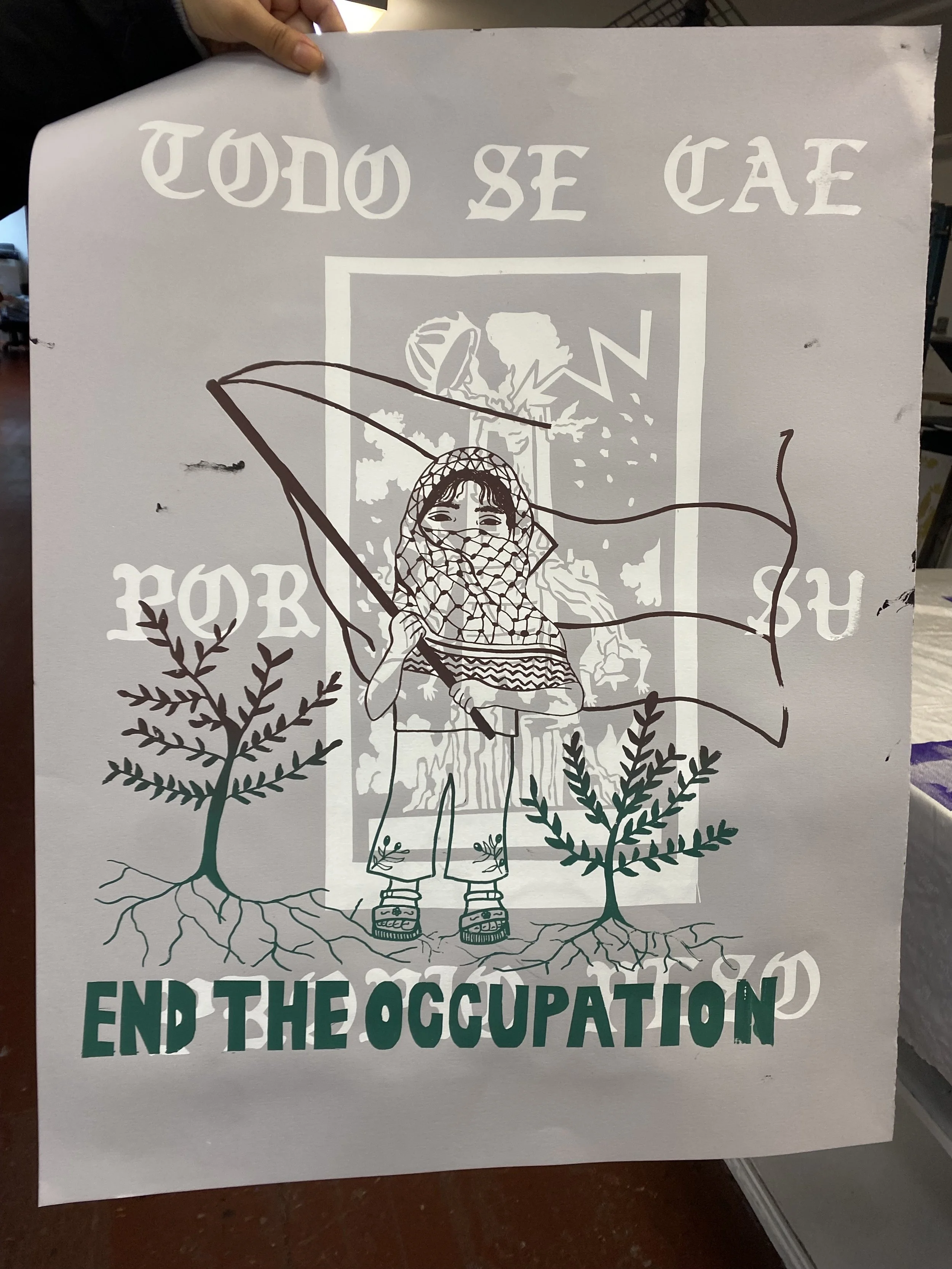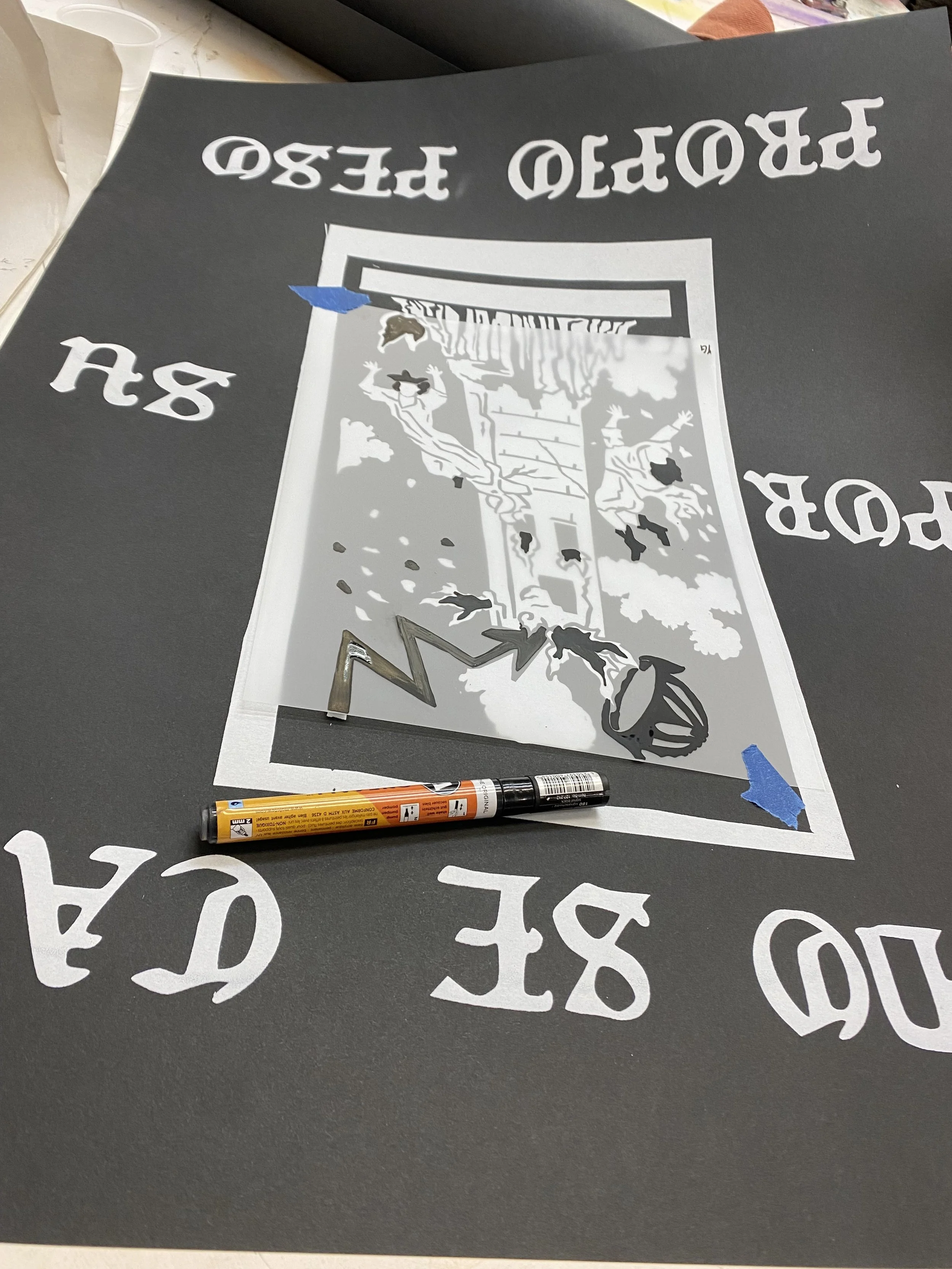 From there I drew the layers for the remaining colors and I consulted with artists and mentors around me on how to go about achieving a metallic finish to my print. In the end the print had a white, red, gold, and metallic gray layer. I wanted this print to be relatively large and so I had to print out my text and tape it to a large transparency to then print on a fairly large screen. I printed the white amongst my peers in Grafica, but then exposed the rest of the layers and printed those in my personal studio.