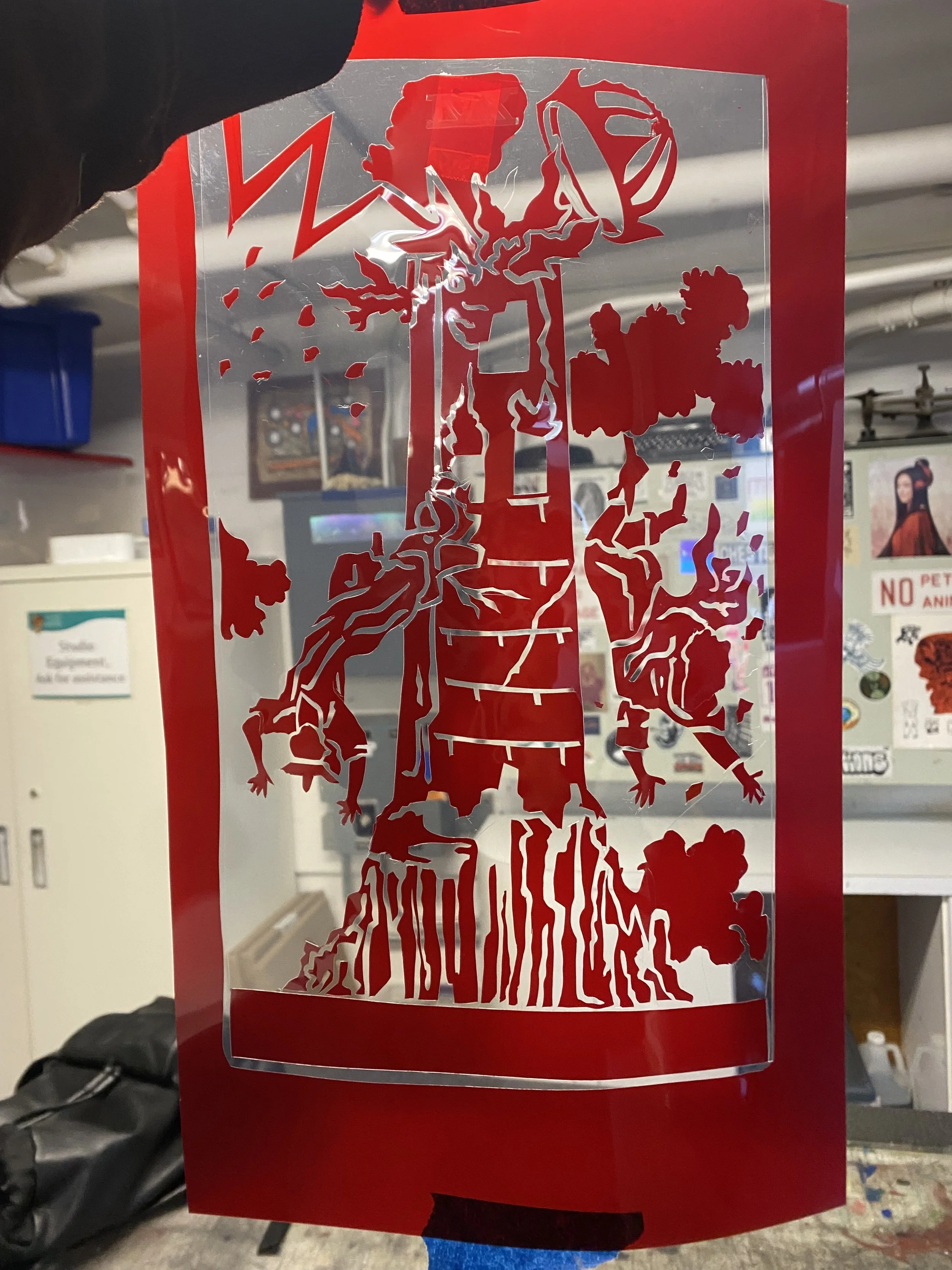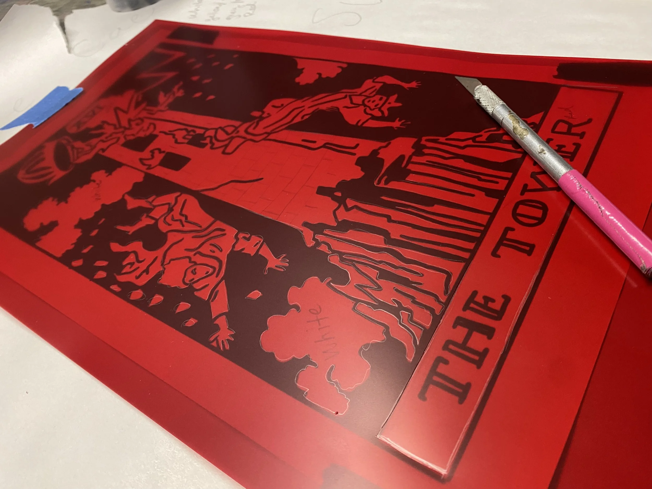 As I was working on the tower with the rubylith I found myself reminiscing about all of the towers that I have experienced in my 26 years of life. I sat alone in Grafica playing Adele as it rained and I cried as I peeled the bits of ruby. It was a cathartic experience and I found myself thinking about what it means to connect with tarot cards in this way- through my work.