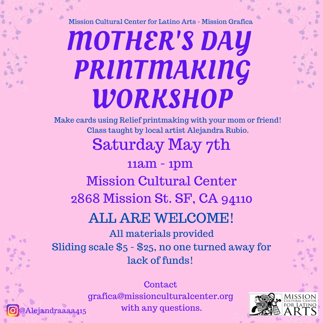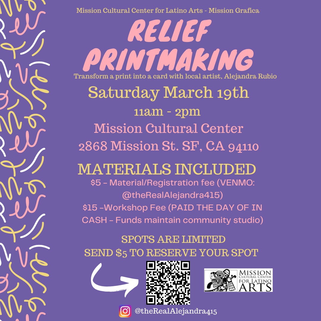 In collaboration with Mission Grafica and the Mission Cultural Center for Latino Arts I was able to host my first in person workshop on 3/19. I had 8 people registered and was able to take participants on a walk in basis. This class ended up having 9 community members varying in age.